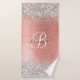 Easily personalise this trendy chic bath towel set design featuring pretty silver sparkling glitter on a rose gold brushed metallic background.