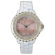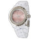 Discover timeless elegance with this rhinestone white enamel watch for women, adorned with a chic rose gold brushed metal detail and sparkling glitter accents. The watch features a personalised monogram, where an initial gracefully strikes through the name, adding a sophisticated touch. This piece effortlessly combines functionality with style, making it a stunning accessory for any occasion.