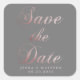Grey background with rose gold calligraphy custom script "save the date" and your own monograms in elegant font. This sticker pairs beautifully with our cards and envelopes.