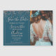 Rose gold confetti save the date photo with elegant script font typography , faux rose gold foil confetti and geometric frame on an editable dark teal blue background.