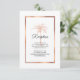 Provide your guests with all of your wedding reception details with this elegant enclosure card featuring modern script, charcoal grey text including an artistic palm tree and metallic rose gold copper frame on the front of the card. A white and grey marble background is on the back.