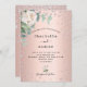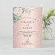 A glamourous wedding invitation. A rose gold faux metallic looking background. Decorated with pink faux diamonds and watercolored white flowers florals with greenery. Personalise and add your names and wedding details. Black text.