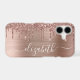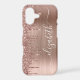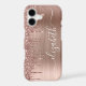 Custom elegant and girly phone case featuring rose gold faux glitter dripping against a rose gold faux metallic foil background. Personalise with your name in a stylish trendy white script with swashes.