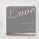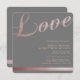Elegant and stylish simple calligraphy invitation with rose gold twist. Modern layout with custom calligraphy faux foil script "love" in rose gold with modern font for all information and rose gold border at the bottom on a grey background. Check our store for more matching items from our "rose gold calligraphy" collection.