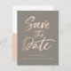 These Save the Date postcards feature an elegant script font in a faux foil look rose gold and grey colour palette.
