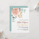 A chic white background. Decorated with a large rose gold and blush pink floral, rose flower and green watercolored eucalyptus leaves, sprigs, greenery and a faux gold sprig. Personalise and add your name and party details.