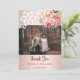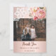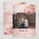 A modern wedding Thank You photo card. A rose gold gradient background decorated with pink roses, flowers and lace. Personalise and add your photo on the front and thank you note on the back.