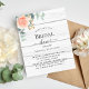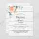 Rustic white wood as background. Decorated with a rose gold and blush pink floral, rose flower and green watercolored eucalyptus leaves, sprigs, greenery and a faux gold sprig. Personalise and add the name of the bride to be and party details.