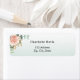 A rose gold and blush pink rose, floral and eucalyptus greenery and faux gold foliage. Personalise and add your name and address. Black letters.