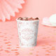 Celebrate the imminent arrival of a precious newborn with a stunning rose gold, pink, and white papel picado style baby girl shower paper cup. This unique hat, influenced by Mexican folk art, features intricate designs of rose gold pink flowers, leaves, dots, and tiny hearts on a pristine white background, adding an air of elegance and cultural significance to the joyful occasion.