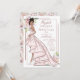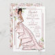 Pink floral bridal shower invitation features a bride to be in a rose gold glitter wedding gown. Choose hair and skin colour to match the bride.