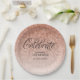 This trendy rose gold ombre glitter pattern paper plate features faux rose gold sparkly glitter, swirly "Celebrate", and a your personalisation. Add your custom text using the template form. Additional options for text and layout are available if you choose to customise further.