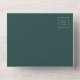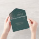The left-hand edge of this elegant modern all-in-one wedding invitation and RSVP features a rose gold faux glitter border. The customizable text combines rose pink whimsical handwriting, copperplate and italic fonts on a dark green background. The return address appears on the outside flap and the reverse side of the detachable RSVP card in rose pink text on solid dark green. A QR code is included on the RSVP card for guests who would prefer to reply online.