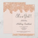 A modern, original and simple faux rose gold glitter drips It's a girl baby shower invitation on a fully customisable blush pink colour background