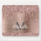 Modern, girly rose gold glitter drips name and monogrammed mousepad. This design features blush pink rose gold glitter sparkle drips on pink brushed metal background with custom personalised monogram initial and first name text template. Perfect feminine gift. Please note, this design is printed photo effect. If you need help or matching items, please contact to me.