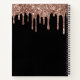 This stylish custom notebook features a glamourous, girly design on a black background. Rose gold glitter sequins are dripping across the top portion. Monogram initials are placed beneath the glitter, followed by a sample name printed in an elegant script font. The back of the notebook features a matching rose gold background with glitter drips.