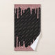 Trendy Pink Rose Gold Glitter Sparkle Drips Bath Towel Set featuring your custom name in stylish handwritten typography and in a chic pattern on a background of girly faux glitter drips on a chic black background. Perfect for your glitter aesthetic. Please contact us at cedarandstring@gmail.com if you need assistance with the design or matching products.