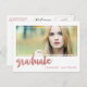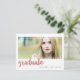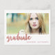 Elegant modern photo postcard inviting your family and friends to your daughter's graduation party. Simple Script Photo Frame | Graduation Party Invitation. Design by Elke Clarke © A simple rose gold foil typography handwritten bold script font (printed photo effect) with the word "graduate" with a photo frame design. Replace sample photo with your own. White and pink rose gold colours. Other styles and colours available.