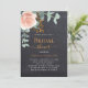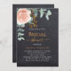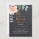 Chalkboard background. Decorated with a rose gold and blush pink floral, rose flower and green watercolored eucalyptus leaves, sprigs, greenery and a faux gold sprig. Personalise and add the name of the bride to be and party details. White and golden coloured text.