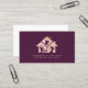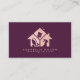 Modern cleaning services business card features cleaning equipment inside rose gold house icon, name and title on the front on a dark burgundy background. Perfect for domestic and industrial cleaning services.