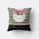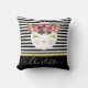 Rose gold kitty princess monogram pillow. Pretty cat princess face in rose gold, blush pink and gold glitter, pink heart shaped nose and big golden glitter eye lashes, with a crown and pink and red roses floral arrangement. Black and white lines striped background with golden ribbon. Easily customise and add your name to personalise the pillow.