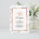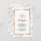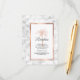 Provide your guests with all of your wedding reception details with this elegant enclosure card featuring modern script, charcoal grey text including an artistic palm tree and metallic rose gold copper frame on the front of the card. A white and grey marble background is on the front and back.