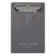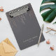 Chic clipboard features two lines of custom text in classic white lettering on a rich medium grey background with vertical strands of faux rose gold foil string lights cascading from the top. Design repeats on reverse side. Please note that this clipboard is a mini size; full size version also available in our Rose Gold Marquee collection.