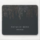Chic personalized mousepad displays your name, business name or choice of custom text in classic white lettering on a rich soft black background with vertical strands of faux rose gold foil string lights cascading from the top.