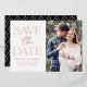 Announce your wedding date in style with our modern photo save the date cards. The front of the design features your engagement photo with "Save the Date" displayed in rose gold foil serif and script fonts against a white background. Personalise the front of the photo save the date card by adding your names, wedding date, and wedding location. The elegant save the date card reverses to display a black and white trellis pattern.