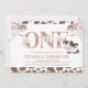 Girls cow themed first birthday invitation featuring a faux rose gold foil word adorned with flowers, two larger pink boho floral arrangements and a brown cow print pattern. This girl's cow themed first birthday invitation is ideal for a cow themed first birthday party.