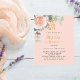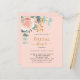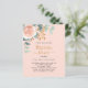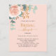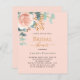 A trendy peach coloured background. Decorated with a rose gold and blush pink floral, rose flower and green watercolored eucalyptus leaves, sprigs, greenery and a faux gold sprig. Personalise and add the name of the bride to be and party details. Black, green and golden coloured text.