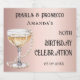A rose gold background colour. Decorated with a glass of golden sparkling Prosecco and pearls. Add a name and a date.