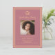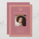 Rose gold background, decorated with a golden frame, and a faux gold graduation cap. Personalise and add a photo name and details. White text.