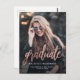 Modern graduation announcement postcard featuring a custom vertical photo. The word "graduate" appears in rose gold faux foil script, with the graduate's name, school, and year of graduation below in white sans serif font. Easily replace the sample image with your own graduate's photo. A black gradient screen helps ensure the text pops. Personalise the return address on the reverse. Ideal for high school or college graduation.