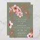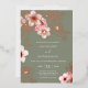This elegant floral wedding invitation features a real rose gold foil line art flowers and pink cherry blossoms on a sage green background.