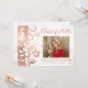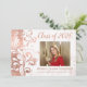 Pretty photo graduation announcement with white background with fancy stunning white curling swirls and scrolls. Pretty, girly yet classy and formal style. Elegant rose gold print (not real foil) and white adds the perfect touch.