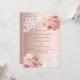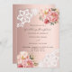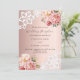 For an elegant and romantic wedding reception. A rose gold gradient background decorated with pink and rose gold florals, roses and lace. Personalise and add your names and details.