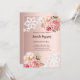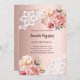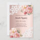A rose gold gradient background decorated with pink and rose gold florals, roses and lace. Personalise and add a name and party details.