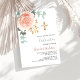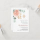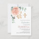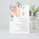 Rose gold and blush pink florals, eucalyptus greenery and a golden cross. Personalise and add a name and details.
