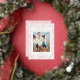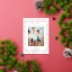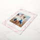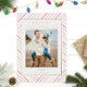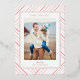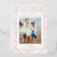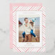 Elegant, simple stripes in seasonal shades of peppermint red and real rose gold foil surround a family photo with personalised holiday greeting and name.