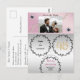 The embossed silver floral holds information you wish to convey at that time. A unique gold and glitter number and a row of wavy white pearls behind the custom photo add chic to the final design.
