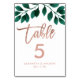 Rose gold script green leaf white wedding table number with elegant faux rose gold typography with watercolor green leaf foliage on white concrete, perfect for industrial chic style wedding