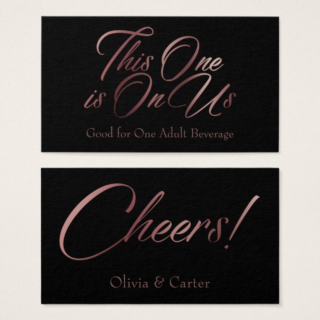 Offer your guests a free drink or two with the help of these simple, elegant drink vouchers. In a pretty, slim script font, the words "This One is On Us" appear in two lines, quite large, on the front of this modern drink ticket. The text has been embellished with a faux rose gold foil ombre effect. "Good for One Adult Beverage" was added to the editable text field in a complementary serif font, at the bottom. Use any other words you like, if you want to change the copy of the editable text. On the other side the graphic text overlay reads "Cheers!" and a template place holder was added for your names. The editable background is black in this design; change it to any colour you like. All layers are unlocked so you can resize or re-position any part of this card, if needed, should you want to tweak the design. Please do not hesitate to reach out if you have requests or need customising assistance.