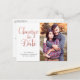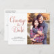 Modern Script Wedding Postponement or Date Change Postcard featuring your photo and trendy script lettering in faux rose gold foil. If you need assistance or matching items, please contact us at cedarandstring@gmail.com