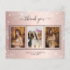 Add 3 of Your birthday photos, vertical size, a date, name, and the thank you note. A blush, rose gold background with black text and frame, a faux silver sparkles. The text: Thank you on the front and your name on the back are written with a stylish hand lettered script with swashes.