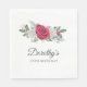 Soft red roses and holly and berries create a beautifully rustic arrangement. Eucalyptus leaves and other red flowers add to the winter botanical vibe. The birthday woman's name is written in a large script font. This napkin is part of the Birthday Rose and Holly collection. It contains many DIY templates that let you quickly create invitations and party supplies.