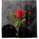 A perfect red rose with red shiny hearts, gold line hearts, and a background of black to grey grunge hearts makes this a dramatic and attractive shower curtain for your own private bath retreat.