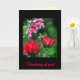 This card expresses the sentiment, "Thinking of you". It features two exquisite little red rose buds in the foreground and a gorgeous clump of sweetly scented red, pink and white lilies in the distance. The vibrant colours glow against the summer greenery. More roses are scattered inside. The text can be customised to suit your needs.
