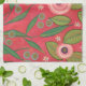 Coral red abstract tea towel featuring roses, berries. leaves, stripes, and scrolls for your cottage core kitchen.