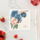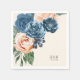 A bright, bold floral of roses in shades of dusty blue and peach is the focal point for many of the pieces of this wedding suite that also features elegant script text and modern design layouts. The wedding paper napkin shown here has a corner border of roses. Easily enter your wedding date and bride and groom's initials using the provided template. Search ID584 to see all the matching pieces in this beautiful wedding set.